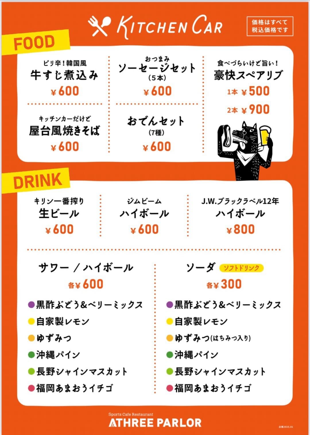 生ビール、サワー、ハイボール、ソフトドリンク等、豊富に揃えています、人気の韓国風牛すじ煮込み、あったかおでん、屋台風焼そば、お酒のお供に、おつまみソーセージセット、自家製スペアリブも是非お試し下さい!